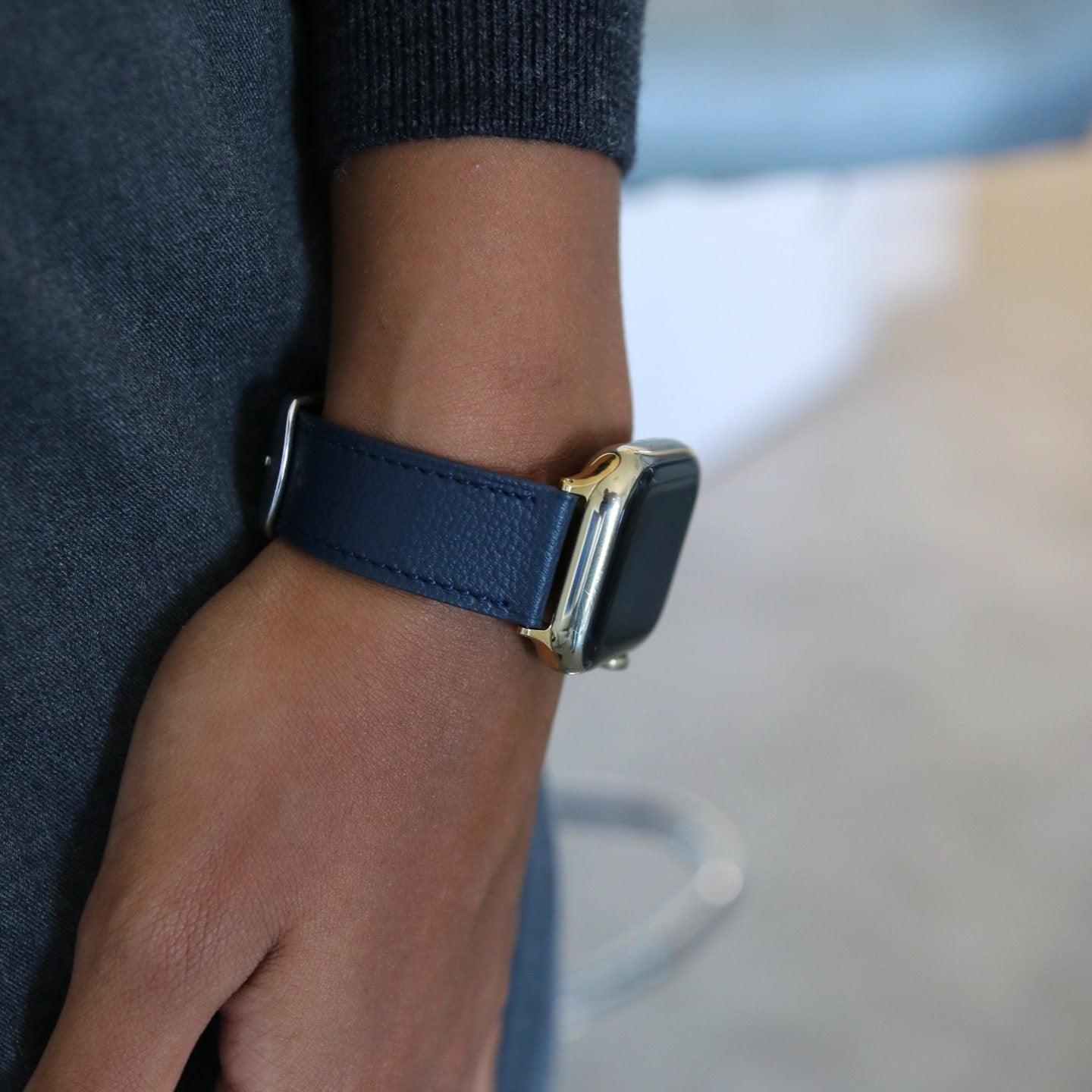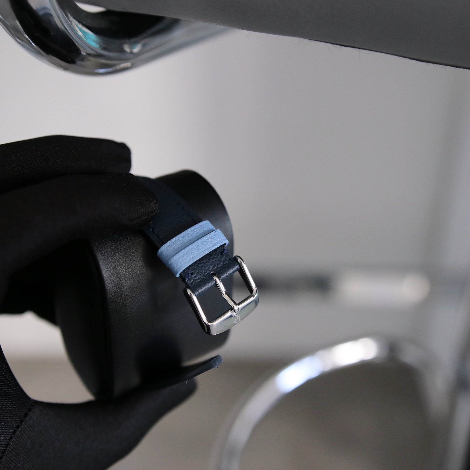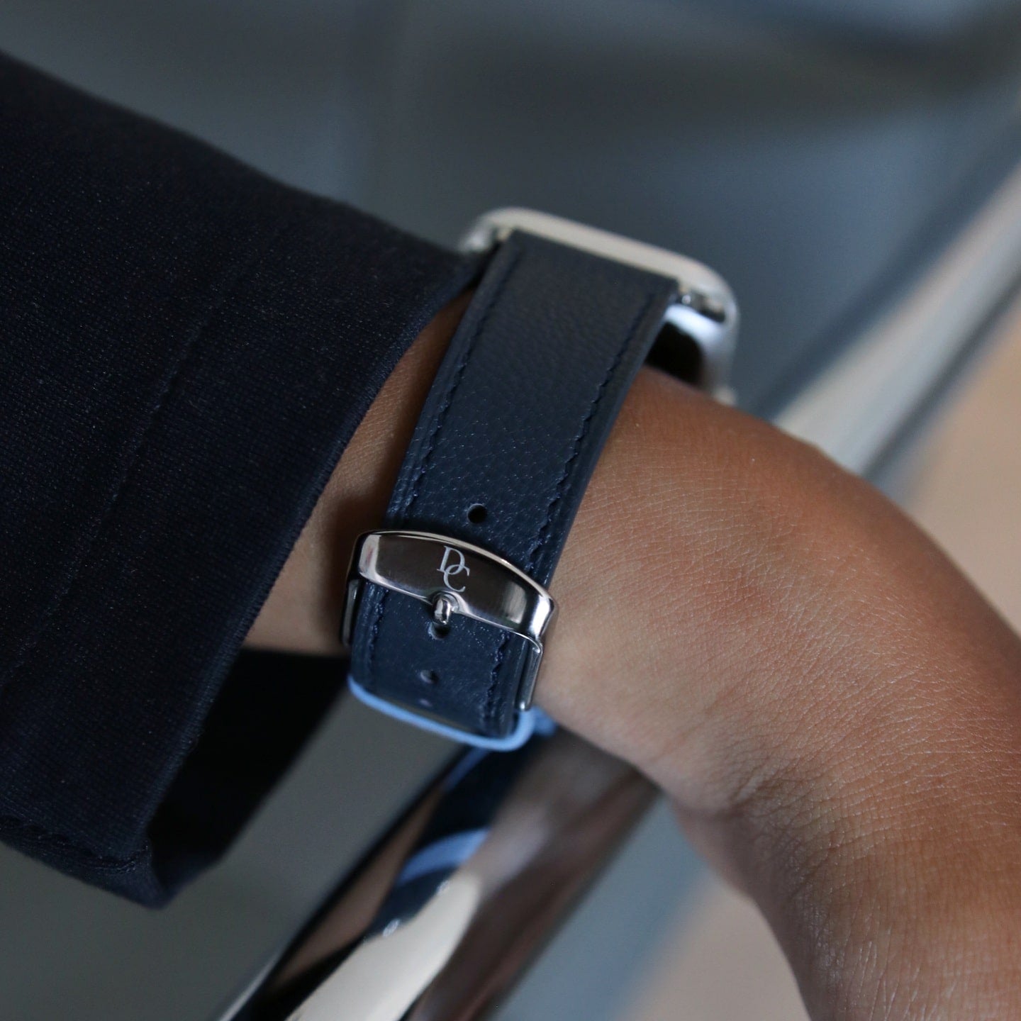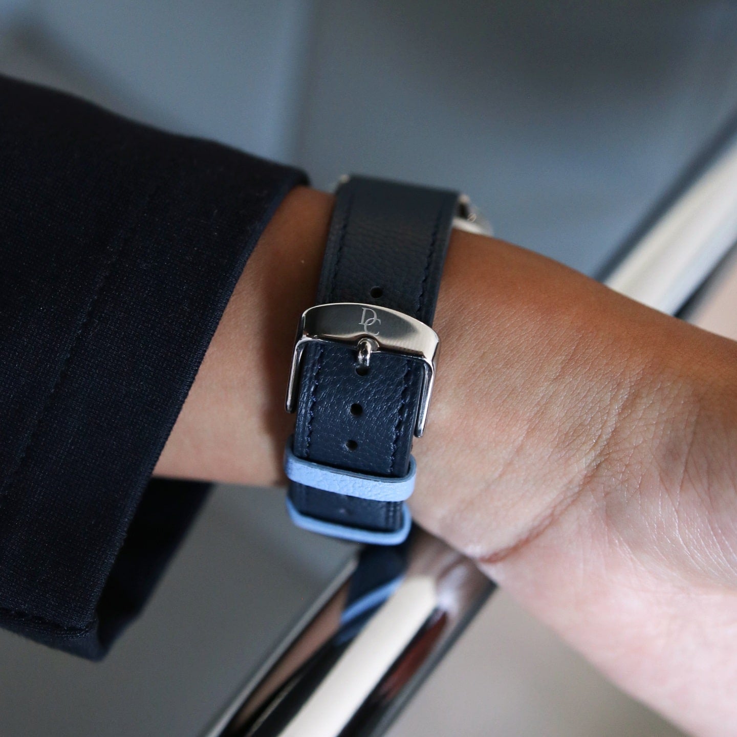 Make a lasting impression with our unique 'Bleu marine Duo Edition' band and experience the epitome of elegance on your wrist. Crafted from two-tone premium Chèvre leather from France, prized for its luxurious feel and association with French haute couture.